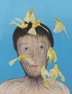 2010Zelfportret met hoofd in kooi van haren en parkieten vrij